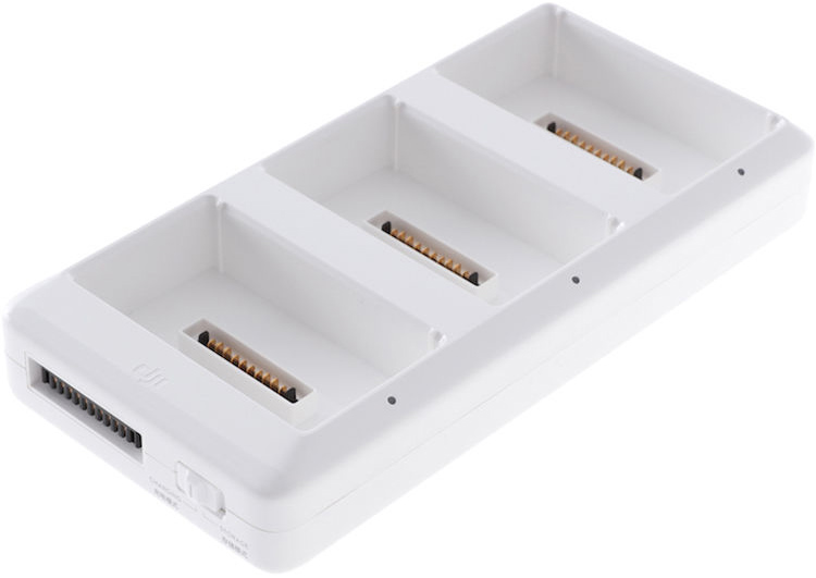 Зарядное устройство для аккумуляторов DJI для Phantom 4 может работать с тремя батареями одновременно, значительно ускоряя процесс подготовки дрона к полету. Оно подает питание последовательно, в порядке убывания остаточного заряда. Весь процесс отнимает до 3,5 часа. В нем также предусмотрен специальный режим Storage Mode, поддерживающий 50-процентный уровень заряда для увеличения срока службы аккумуляторов при длительном хранении.