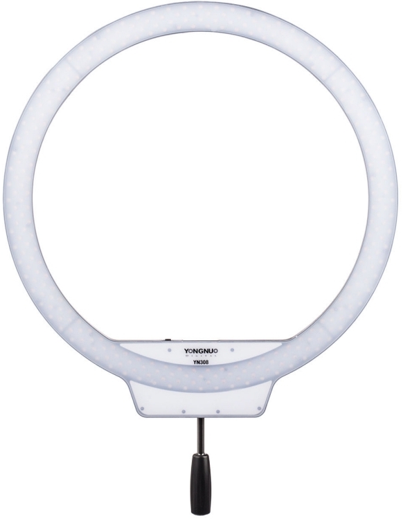 Кольцевой осветитель Yongnuo YN308 пригодится любому фотографу, занимающемуся съемкой портретов, а также fashion-съемкой или макросъемкой. Он обеспечивает мягкий свет и помогает создать бестеневой световой рисунок, эффектно подчеркнуть предмет в кадре. Осветитель можно держать за ручку или установить на стойку. В комплект входит пульт ДУ, с помощью которого можно удобно управлять установленным на стойке осветителем на расстоянии. В этой модели в качестве источника света используются светодиоды, характерными особенностями которых являются низкое тепловыделение и большой ресурс работы.